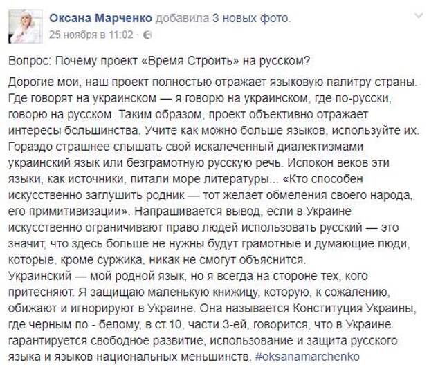 Известная украинская телеведущая Оксана Марченко написала вполне доходчивый пост на тему русского языка. Более того, она дала простую инструкцию, как защитить свои конституционные права.