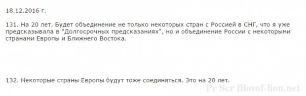 Ясновидящая опубликовала на своем сайте новую порцию информации о том, что произойдет с Россией в ближайшие 20 лет.На сайте Лион под №№131 и 132 можно прочесть, что в ближайшие два десятка лет России предстоит объединиться не только со странами СНГ, как она предсказывала ранее, но и с рядом государств Европы. В данных откровениях вызывает удивление то, что, по утверждению ясновидящей, территория России увеличится и за счет некоторых стран Ближнего Востока.